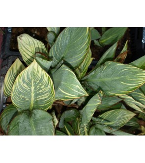 Perenne rizomatosa eretta, varietà ibrida, terreno ricco, neutro, richiede annafiature abbondanti, posizione pieno sole. piantare in primavera, fioritura da metà estate all'autunno avanzato. fiore grande di colore arancio, porta grandi foglie color verde striate di giallo, lucide, altamente decorativa, non sopporta olre i -2°C.. piantare ad una profondità di 5/7 cm, tenendo una distanza di 50/70 cm tra una pianta e l'altra. raggiunge un'altezza di 70/90 cm, utilizzata per bordure, macchie, aiuole, giardini mediterranei al sole, vasi.