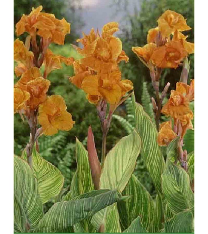 Perenne rizomatosa eretta, varietà ibrida, terreno ricco, neutro, richiede annafiature abbondanti, posizione pieno sole. piantare in primavera, fioritura da metà estate all'autunno avanzato. fiore colore arancione, grande, foglie di colore verde lucide, striate di bianco altamente decorativa, non sopporta olre i -2°C.. piantare ad una profondità di 5/7 cm, tenendo una distanza di 50/70 cm tra una pianta e l'altra. raggiunge un'altezza di 100/120 cm, utilizzata per bordure, macchie, aiuole, giardini mediterranei al sole, vasi.